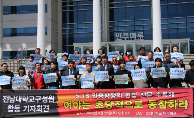 23일 전남대학교에 따르면, 전남대학교 구성원단체(교수·학생·교직원·졸업생)는 이날 오후 2시 전남대학교 민주마루 앞에서 '5·18 민중항쟁의 헌법 전문 수록에 여야는 초당적으로 동참하라'는 공동 기자회견을 개최했다.