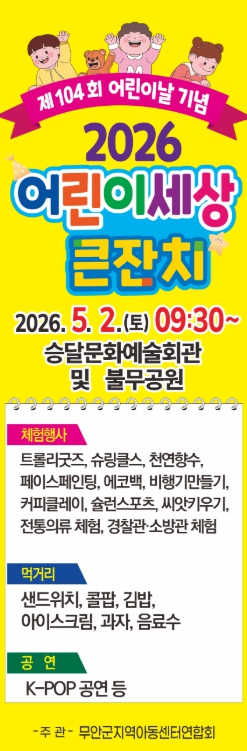 이번 행사는 식전행사와 기념식, 축하공연을 비롯해 체험마당 16종과 먹거리마당 5종 등 어린이와 가족이 함께 즐길 수 있는 다양한 프로그램으로 꾸며지며, 오전 9시 30분부터 12시 30분까지 운영될 예정이다.