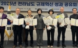 [AI 호남뉴스]전라남도는 23일 목포 샹그리아호텔에서 ‘2025 규제합리화 우수 시군 시상식’을 열고 한 해 규제 개선에 기여한 시군의 성과를 공유했다. 행사는 ▲우수 시군 시상 ▲규제개선 사례 발표 ▲인문 교양 특강 순으로 진행됐다. 우수 시군 시상에서는 광양시가 규제로 중단된 지역 사업을 발굴하고 해결한 성과를 인정받아 최우수상과 상금 400만 원을 받았다. 고흥군과 신안군은 중앙 규제 신규 발굴과 현장 토론회를 통한 개선 노력을 높이 평가받아 우수상과 상금 300만 원을 수상했다. 또 기업의 규제샌드박스 신청을 지원...