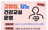 영광 박인석 기자2026. 03.06[AI 호남뉴스]영광군보건소는 만성질환 예방과 군민 건강수명 연장을 위해'2026년 상반기 고혈압·당뇨병 건강교실'참여자 20명을 선착순 모집한다고 밝혔다. 고혈압과 당뇨병은 자각증상이 적어 관리가 소홀해지기 쉬운 대표적인 만성질환으로, 방치할 경우 심뇌혈관질환 등 중증 합병증으로 이어질 수 있어 꾸준한 관리가 무엇보다 중요하다. 이번 건강교실은 3월 24일부터 주 2회(화, 목) 총 8회 과정으로 운영되며, ▲혈압·혈당 기초검사 ▲저염·저당 식생활 실습 ▲맞춤형 운동요법 ▲복약관리 지도 ▲스트레스 관리 프로그램 ▲소근육 ...