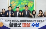 장성 박인석 기자2025. 12.11[AI 호남뉴스]전남 함평군이 가축방역 및 축산물 위생 분야에서 3년 연속 우수한 성과를 거두며 뛰어난 행정 역량을 다시 한번 입증했다. 함평군은 11일 “2025년 전라남도 동물방역위생 시책평가에서 대상을 수상했다”고 밝혔다. 앞서 함평군은 같은 평가에서 2023년 대상, 2024년 최우수상에 이어 올해 다시 한번 대상을 차지하는 동물방역위생 선도 지자체로서의 위상을 더욱 공고히 했다. 이번 평가는 전남 22개 시군을 대상으로 방역정책·동물방역·축산물 위생·방역 대응 등 4개 분야로 진행됐다. 함평군은 4개 지표에서 고...