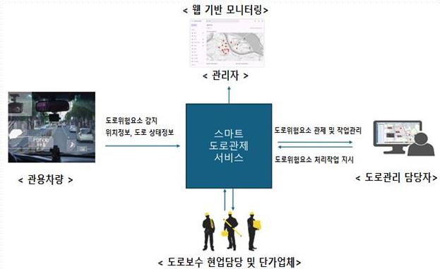 ‘스마트도로관리시스템’은 공용차량에 사물 인식 카메라를 탑재해 도로 주행 중 도로 파임(포트홀) 등 위험 요인을 실시간으로 감지하고, 이를 담당자에게 자동 전송해 신속한 보수가 이뤄지도록 연계하는 체계다. 이후 관내 도로유지관리 업체가 24시간 이내 현장에 출동해 보수하는 구조로 운영된다.