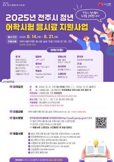 지원 대상은 미취업 청년(1985~2006년생) 중 시험 응시일부터 사업 공고일까지 전주시에 주민등록이 있는 청년이다. 단, 건강보험 직장가입자 및 사업자등록 보유자는 제외되며, 작년 10월부터 올해 7월 사이에 응시한 19종의 어학시험에 대해 지원이 가능하다.
