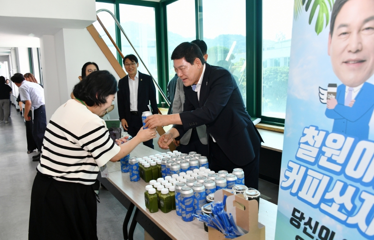 정철원 군수는 지난 집중호우시 비상근무ᐧ피해조사ᐧ복구 등에 선제적으로 대응해 준 공직자들에게 고마움을 전하며, 직접 시원한 음료를 전달하는 깜짝 이벤트로 더위에 지친 직원들을 격려했다.