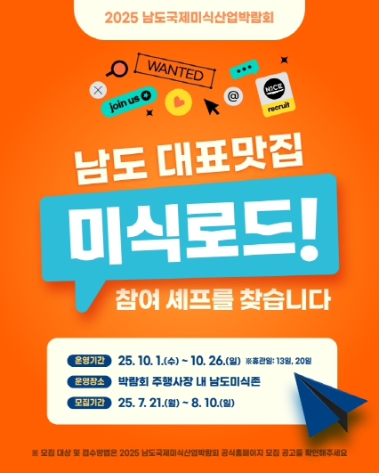 이번 박람회는 남도의 대표 음식문화를 널리 알리고, 지역 내 맛집과 셰프들이 직접 참여해 남도 식재료와 조리 기술을 선보이는 장으로 기획됐다. 행사는 10월 1일부터 26일까지 목포시 문화예술회관 일원에서 개최될 예정이다.