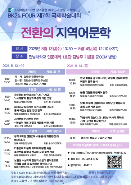 전남대학교 BK21 FOUR 지역어문학 기반 창의융합 미래인재 양성 교육연구단은 오는 8월 13일부터 14일까지 양일간 제7회 국제학술대회를 전남대학교 인문대학 1호관 김남주 기념홀에서 개최하며, 온라인 비대면 학술대회(ZOOOM, 회의 ID: 81748548732, 암호: 404312)도 병행한다.