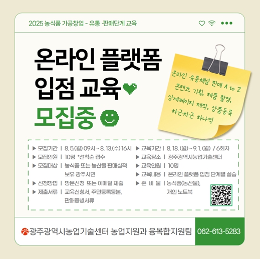 모집 대상은 농식품 또는 농산물의 온·오프라인 판매 실적이 있는 광주시민으로 선착순 10명을 모집한다. 신청은 오는 4일 오전 9시부터 13일 오후 4시까지이며, 농업기술센터 농업지원과(1층)를 방문하거나 전자우편으로 접수하면 된다.