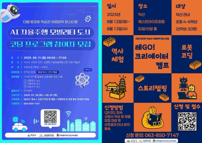 방과후학습관 '더봄'의 여름방학 페스티벌 참여자는 선착순으로 모집하며, 신청은 익산시 누리집 내 다이로움 소식에 게시된 포스터의 큐알(QR)코드를 통해 가능하다.