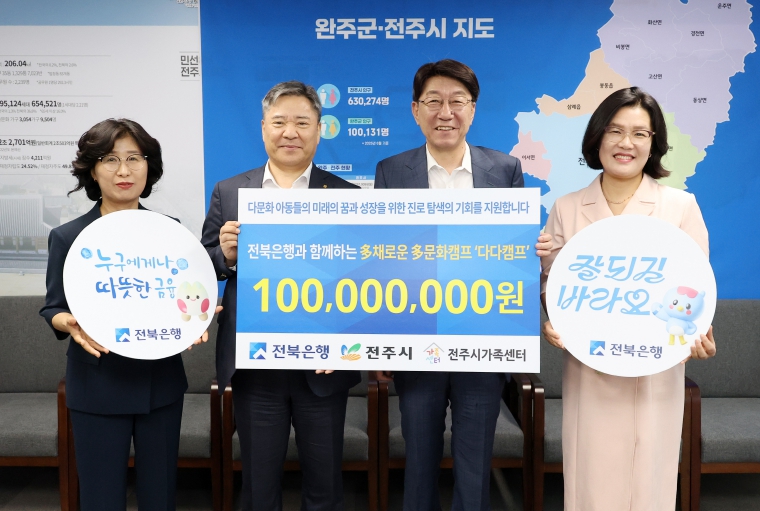 전주시와 전북은행(은행장 백종일)은 4일 전주시장실에서 우범기 전주시장과 백종일 전북은행장, 오현권 부행장, 이해경 전주시가족센터장 등이 참석한 가운데 다문화가정 아동들을 위한 여름방학 ‘다다캠프(多채로운 多문화캠프)’ 지원을 위한 기부금 전달식을 가졌다.