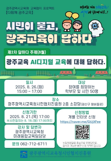 이번 행사는 ‘광주교육 AI 디지털 교육에 대해 답하다’를 주제로 시교육청 미래교육기획과 미래융합교육팀 장학관, 장학사가 디지털 교육 관련 정책을 설명하고 시민들의 궁금증을 해소한다.