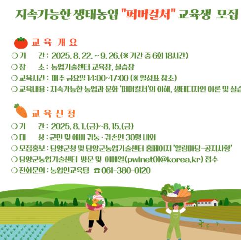 ![]() 담양군, 지속가능한 생태농업 위한 ‘퍼머컬처 교육’ 참가자 모집 |