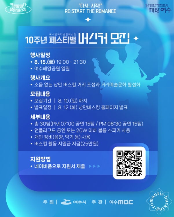 ![]() ‘2025 여수밤바다 낭만버스킹 페스티벌’ 버스커 모집 포스터 |