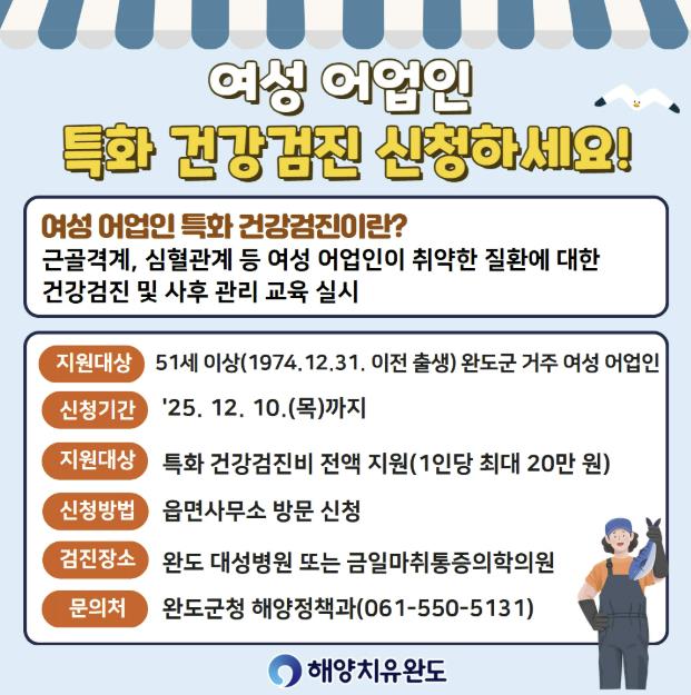 ![]() 완도군, 여성 어업인 건강검진비 전액 지원 |