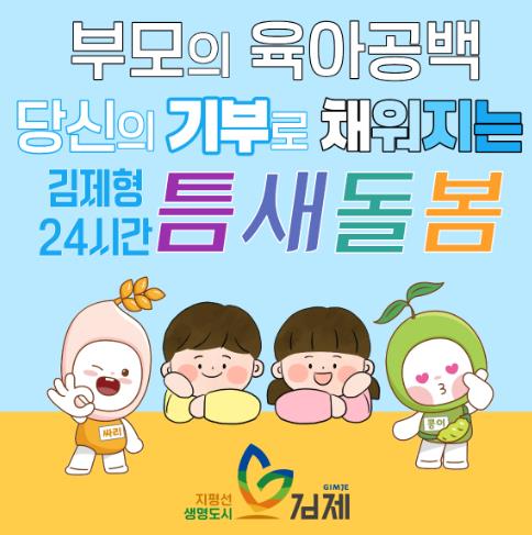 한편, 지정기부사업은 고향사랑e음에 접속해 특정사업에 기부하기를 선택하고 전북특별자치도 김제시의 ‘부모의 육아공백 당신의 기부로 채워지는 김제형 24시간 틈새돌봄’이라 적힌 이미지의 사업을 선택하거나 ‘김제 365일 24시간 아이돌봄센터 운영’을 검색하여 사업에 기부할 수 있다.
