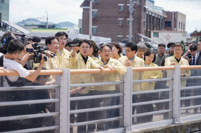 ![]() 강기정 광주광역시장이 지난 7월20일 오전 김민석 국무총리와 폭우 침수 피해 지역인 북구 신안교 일대를 돌며 피해 현장을 살펴보고 있다./광주광역시 제공 |