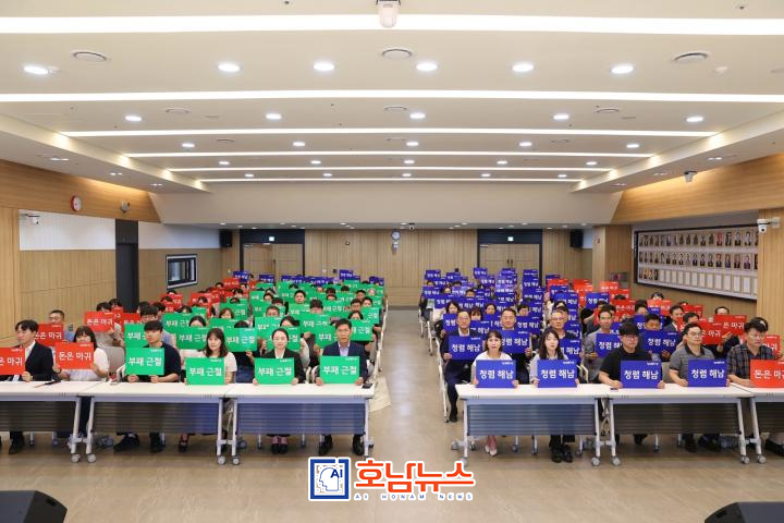 반부패·청렴 서약식 직후에는 서약식에 참석한 전 직원이 함께 청렴 문구가 적힌 카드를 활용해 퍼포먼스를 펼치며 해남군의 청렴 의지를 강조했다.
