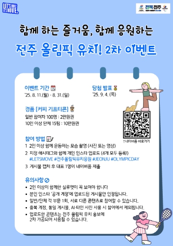 이번 행사는 8월 11일부터 31일까지 전국 누구나 2인 이상이 함께 움직이는 모습을 사진이나 영상으로 촬영해 개인 SNS에 게시하고, 필수 해시태그(#LETSMOVE #전주올림픽유치응원 #OLYMPICDAY #JEONJU)를 달면 참여할 수 있다. 스트레칭, 산책, 댄스, 러닝 등 가벼운 활동도 가능하며, 게시물 캡처와 함께 참가 신청서(네이버 폼)를 제출하면 응모가 완료된다.