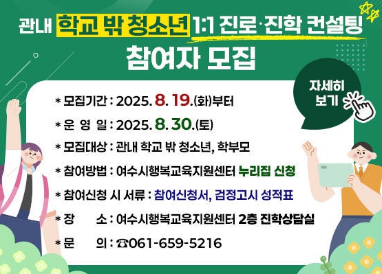![]() 여수시행복교육지원센터 ‘관내 학교 밖 청소년 1:1 진로‧진학 컨설팅‘ 포스터 |