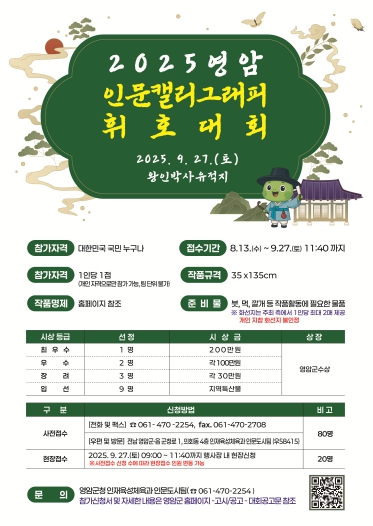인문캘리그래피 휘호대회에 대한 자세한 내용은 영암군홈페이지에서 볼 수 있고, 안내는 인문도시팀에서 한다.