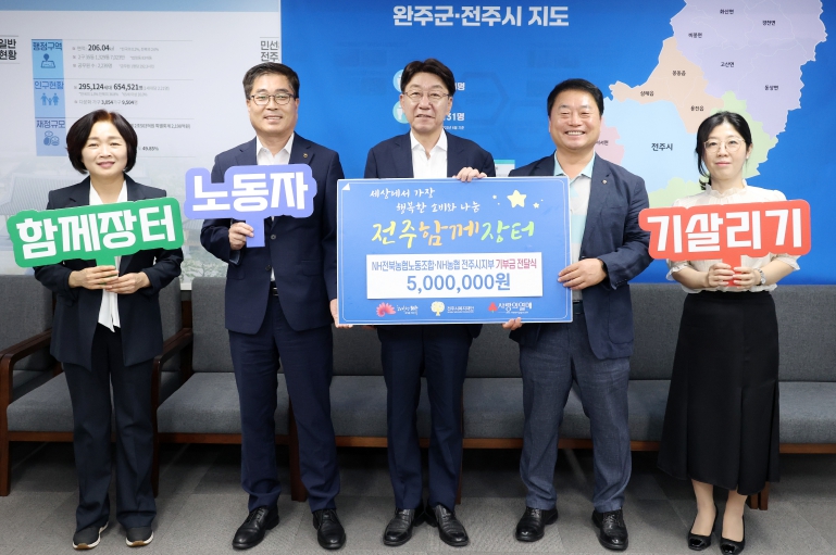 전주시와 NH농협 전북지부 노동조합(위원장 박병철), NH농협은행 전주시지부(지부장 하양진), NH농협 전주시청지점(지점장 김혜영)은 지난 11일 전주시장실에서 우범기 전주시장과 박병철 NH농협 전북지부 노조위원장 등이 참석한 가운데 ‘전주함께장터 기부금 전달식’을 가졌다.