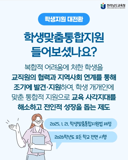 한편, 전남교육청은 학생맞춤통합지원을 통해 위기 상황에 놓인 학생들을 조기에 발굴하고 학생 중심의 맞춤형 통합지원 서비스를 제공하는 등 지속가능한 학생 지원 체계를 가동하고 있다.
