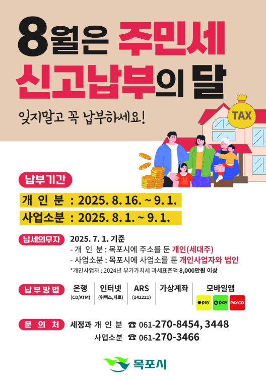 2025년 7월 1일 현재 목포시에 주소를 둔 개인(세대주)에게 개인분 주민세가 부과되며, 기초생활수급자, 미성년자, 30세 미만 미혼 단독 세대주는 과세에서 제외된다.