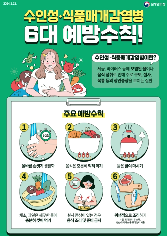 예방수칙은 다음과 같다. 외출 후·식사 전·배변 후에는 반드시 30초 이상 손을 씻고, 끓인 물이나 포장된 생수 등 안전한 물과 충분히 익힌 음식을 섭취해야 한다.