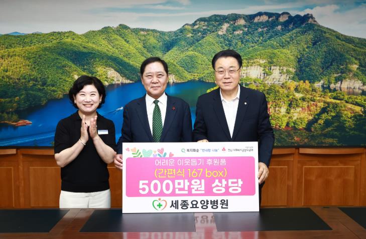 ![]() 세종요양병원 간편식(쌀국수) 기탁식 - 사진 가운데가 구제길 이사장 |
