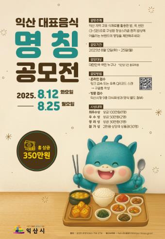 익산시 관계자는 "이번 공모전은 시민이 직접 익산의 맛과 정서를 담아낼 수 있는 좋은 기회"라며 "선정된 명칭을 기반으로 익산만의 음식 브랜드를 전국에 알릴 수 있도록 하겠다"고 밝혔다.