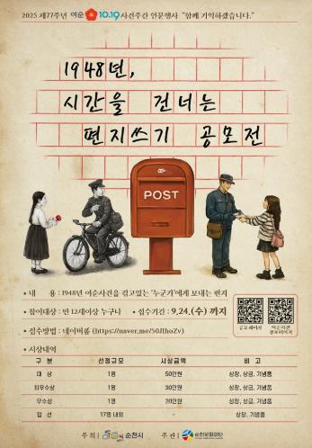 ![]() (재)순천문화재단, ‘1948년, 시간을 건너는 편지쓰기 공모전’ 개최 |