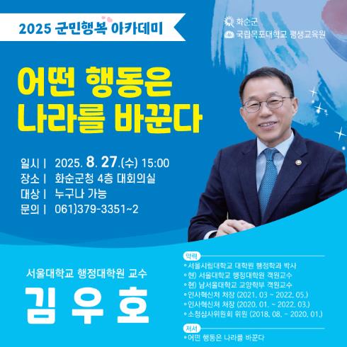 이번 강연은 김 교수가 공직 현장에서 쌓은 풍부한 경험과 깊이 있는 통찰을 바탕으로 군민들과 소통하는 자리로서 더욱 뜻깊은 시간이 될 것이다.