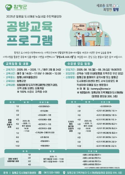교육은 9월부터 11월까지 진행되며, 공방교육과 문예 교실로 구성됐다. 모집인원은 선착순 15명으로 함평군민이면 누구나 참여할 수 있다.