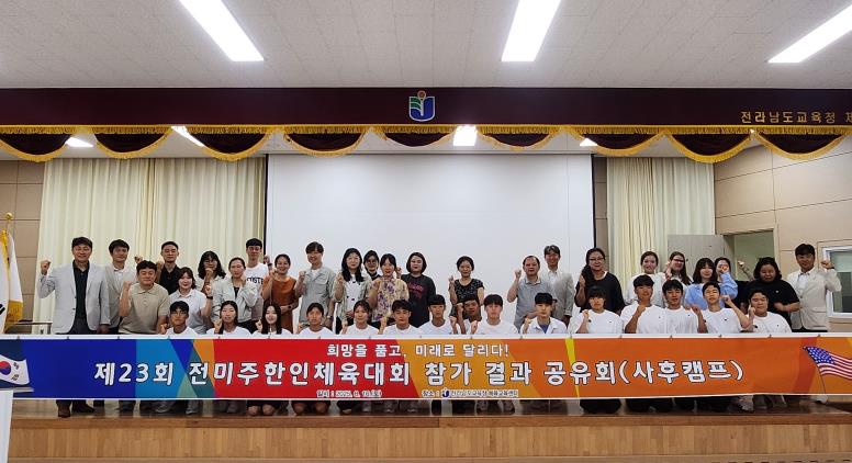 ![]() 제23회 전미주한인체육대회에 참가한 전라남도 학생선수단이 기념사진 촬영을 하고 있다. |