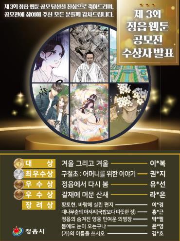 심사위원단은 “올해는 특히 작화가 뛰어난 작품이 늘었고, 의병장 민여운 등 잘 알려지지 않은 정읍의 문화·역사 인물을 조명한 작품이 많아진 점이 고무적”이라고 총평했다.