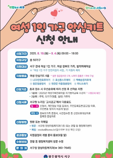 지원 대상은 서구에 거주하는 여성 1인 가구와 한부모 가족, 범죄 피해 여성 등으로 총 50가구를 선정한다. 신청 기간은 오는 19일부터 9월 4일까지이며 서구청 누리집 고시공고란에 게시된 서류를 준비해 서구청 양성아동복지과 또는 거주지 동 행정복지센터로 방문하거나 이메일로 제출하면 된다.