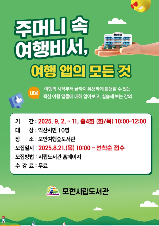 익산시 관계자는 "이번 강좌는 누구나 스마트폰을 활용해 나만의 맞춤형 여행을 기획할 수 있는 계기가 될 것"이라며 "시행착오를 줄이고 여행의 즐거움을 누리는 기회가 되길 바란다"고 말했다.
