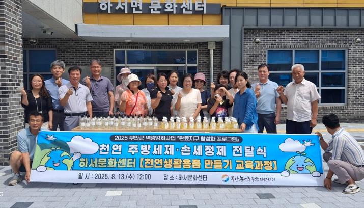 참여자들은 친환경 재료를 활용해 주방세제 50개와 손세정제 50개, 총 100개를 제작했으며, 완성된 천연생활용품은 하서면 경로당과 마을회관에 비치돼 주민들이 함께 사용할 예정이다.