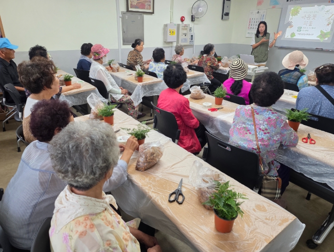 이번 프로그램은 무더운 여름철 복지관 무더위쉼터를 이용하는 어르신들의 우울감 해소와 심리적 안정을 위해 8월 한달동안 총 4회에 걸쳐 진행됐으며, 참여한 어르신들은 직접 화분에 식물을 심고 이야기를 나누며, 정서적 교류 활동을 통해 웃음꽃이 피어나는 시간을 보냈다.