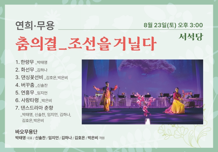 공연은 총 3부로 구성된다. 1부 ‘조선_춤이 되다’에서는 '사풍정감(한량무)'과 '화선무'를 통해 조선 시대를 대표하는 춤을 선보이며 한국무용의 정통성과 아름다움을 되새긴다. 2부 ‘ 조선_춤으로 피어나다’에서는 '댄싱꽃선비', '버꾸춤', '연홍무', '사랑타령'을 통해 전통을 토대로 한 창작 작품을 선보이며 무용의 확장과 발전을 시도한다. 마지막 3부 ‘조선_춤과 마주하다’에서는 '댄스드라마 춘향'을 통해 과거와 현재가 만나는 지점을 탐색하며, 고전 서사가 현대적 감각과 결합해 새로운 무용극으로 관객에게 색다른 감동을 전할 예정이다.