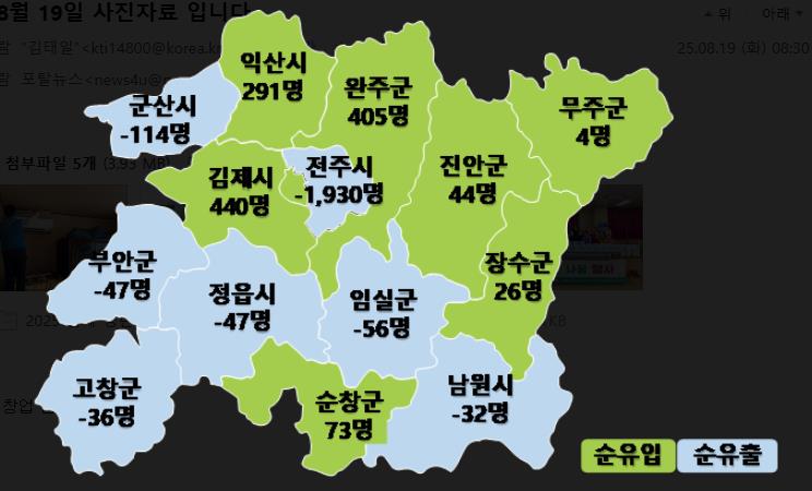 19일 시에 따르면 지난 12일 호남지방통계청이 발표한 '2025년 2분기 전북지역 인구이동'자료에서, 전주시(-1,930명), 군산시(-114명) 등 주요 도시들이 순유출을 기록한 반면, 김제는 전입 인구가 전출 인구를 크게 앞서며 440명 순유입으로 도내 최대 인구 증가폭을 보였다,