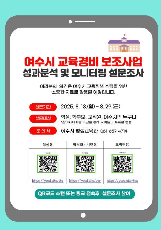 한편, 여수시는 올해 교육경비 예산 총 100억 원을 편성해 44개 사업을 여수교육지원청과 각급 학교에서 추진하고 있으며 설문 참여 과정에서 현재 추진 중인 사업 현황도 함께 확인할 수 있다.