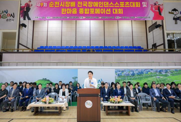 ![]() 지난 17일 노관규 순천시장이 팔마실내체육관에서 열린 제9회 순천시장배 전국장애인댄스스포츠 대회에서 대회사를 하고 있다 |