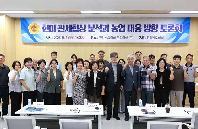 ![]() 8월 18일, 전라남도의회 중회의실에서 열린 ‘한미 관세협상 분석과 농업 대응 방향 토론회’ 참석자들이 단체 사진을 찍고 있다. |