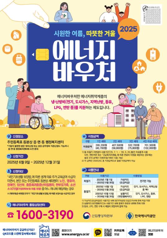 에너지 바우처(이용권) 사업은 냉난방에 필수적인 에너지(전기, 가스, 지역난방, 등유, LPG, 연탄) 사용 비용을 지원하는 제도로 하절기 전기 요금 차감, 동절기 난방 연료 구입에 사용할 수 있다.