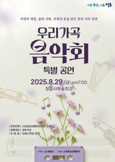 ![]() 정읍사예술회관서 29일 ‘우리 가곡 음악회’ 특별공연 |