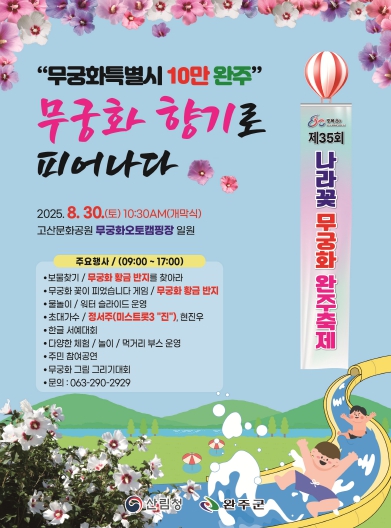 유희태 완주군수는 “나라꽃 무궁화에 많은 분들이 관심과 애정을 가질 수 있는 계기가 될 수 있도록 축제를 준비하고 있다”며 “가족과 함께 나라꽃 무궁화를 감상하고 맑고 시원한 물이 흐르는 시랑천에서 물놀이도 함께하며 즐거운 시간을 가졌으면 한다”고 말했다.