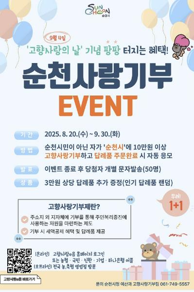 이벤트 기간 내 순천시에 기부한 개인 중 추첨을 통해 총 50명을 선정, 3만 원 상당의 인기 답례품 1종을 추가로 제공할 계획이다.