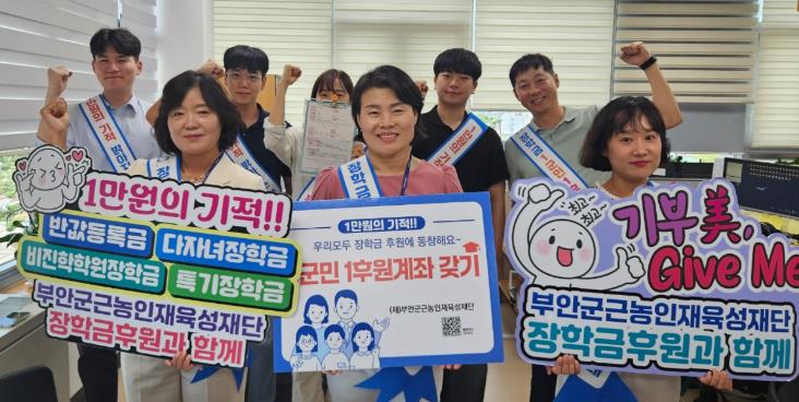 한편, (재)부안군근농인재육성재단은 지난 7월부터 안정적이고 건전한 재단 기금 확보를 위해 “군민과 함께하는 1만원의 기적,『장학금 1군민 1후원계좌 갖기』” 캠페인을 추진하고 있다.