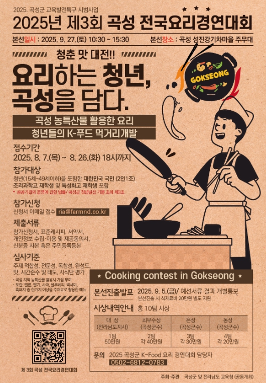 군 관계자는 “요리경연대회를 통해 청년들의 창의적 요리 아이디어와 곡성 농산물의 가치를 결합하여 지역 농업과 K-Food 음식문화의 경쟁력을 높여 나가는 계기를 마련하고 청년창업의 원동력이 될 수 있는 요리경연대회를 추진할 계획이다”라고 밝혔다.