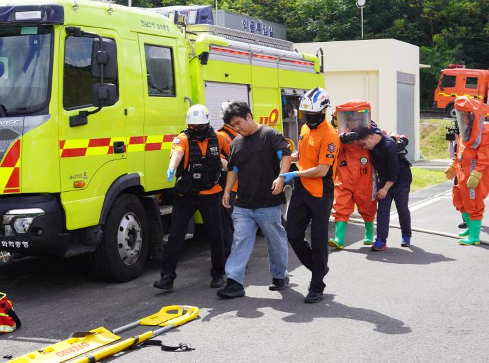 이번 훈련에는 여수소방서를 비롯한 10개 유관기관이 참여해 ▲자폭 드론 출현에 따른 화학(폭탄) 테러 대응 ▲재난안전통신망을 활용한 기관 간 합동대응 등을 중점적으로 훈련한다. 여수소방서는 화학구조대 중형펌프차, 구급차, 구조공작차 등 차량 4대와 인원 14명을 투입해 초기 대응과 인명구조 활동을 수행했다.